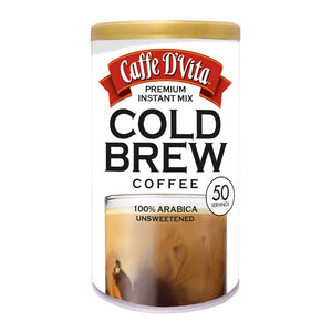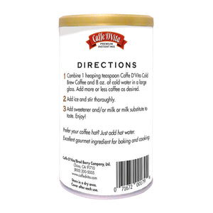 Our premium instant Cold Brew Coffee easily dissolves in cold water and is smooth and full bodied with a complex taste profile of rich dark chocolate and sweet caramel. Made with 100% Arabica premium coffee beans, it is perfect for those who don't have the time to wait but love a cold iced coffee beverage in an instant. Just mix with water and ice for a taste that’s delicious and perfectly yours. This canister makes 50 servings of cold brew coffee when prepared as directed.